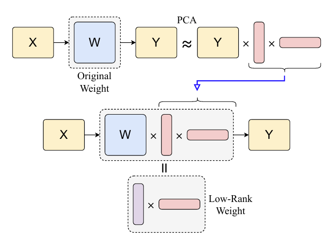 - (Eq. 3)의 PCA approximation을 활용하여 original linear layer $Y=XW+b$를 low-rank matrix multiplication의 combination으로 rewrite 할 수 있음