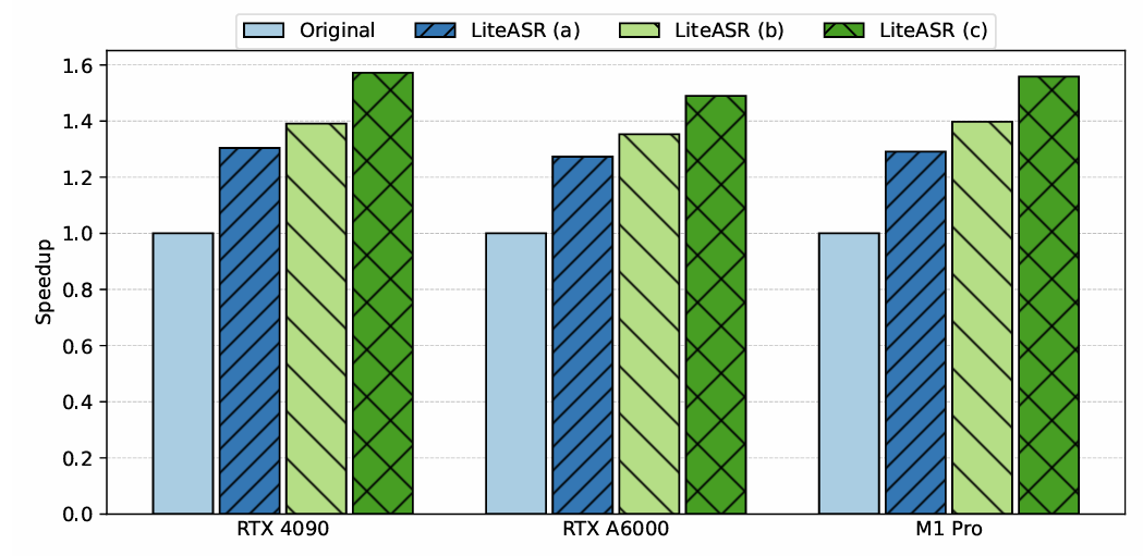 - Inference speed 측면에서도 LiteASR이 가장 빠름