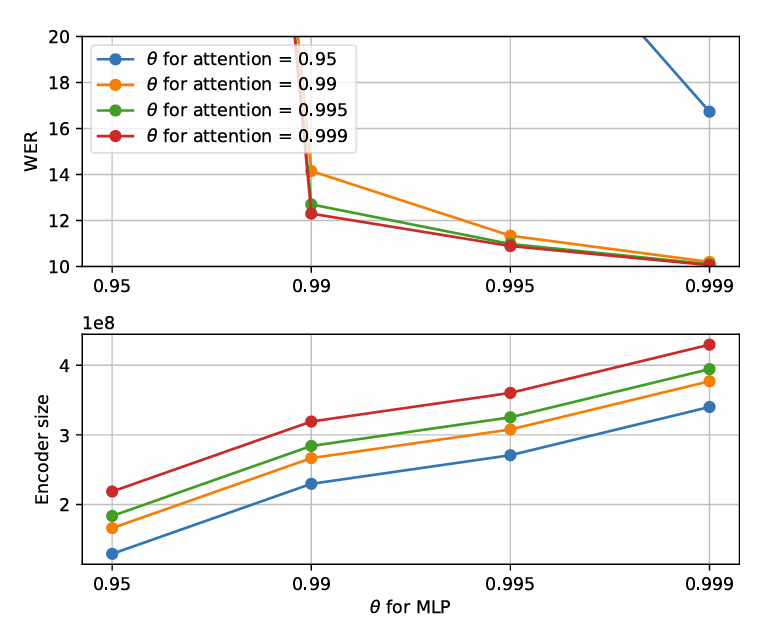 - WER 저하를 최소화하면서 encoder size를 $10\%$ 줄일 수 있음