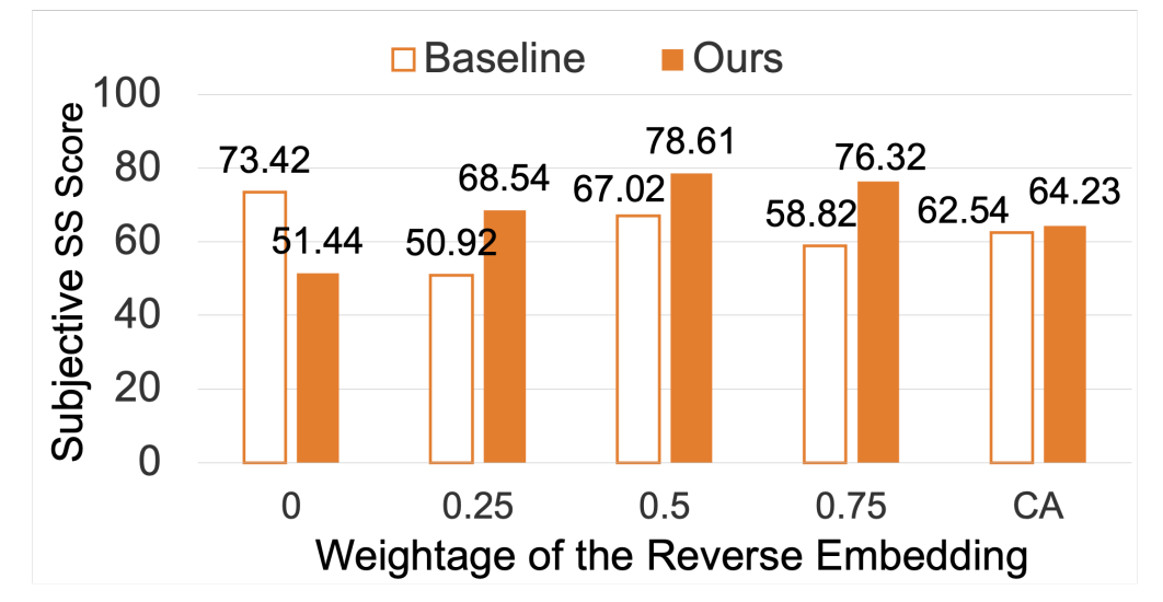 - 실제로 WER과 speaker similarity (SS)를 비교해 보면, complete speech reversal이 linguistic interference 없이 speaker identity를 preserve 하는데 더 효과적임