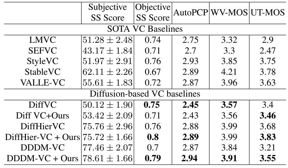 - Comparisons : StyleVC, DiffVC, Diff-HierVC, LM-VC, SEF-VC, StableVC, VALL-E