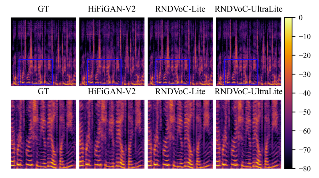 - RNDVoC-Lite와 RNDVoC-UltraLite는 더 적은 parameter로 HiFi-GAN 보다 나은 성능을 달성함