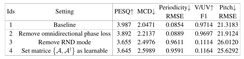 - $\{\lambda_{a},\lambda_{p},\lambda_{ri},\lambda_{mel},\lambda_{c}\}$ : hyperparameter - 기존 APNet에서는 Instantaneous Phase (IP), Group Delay (GD), Instantaneous Frequency (IF)를 specially-designed sparse matrix를 통해 추출함