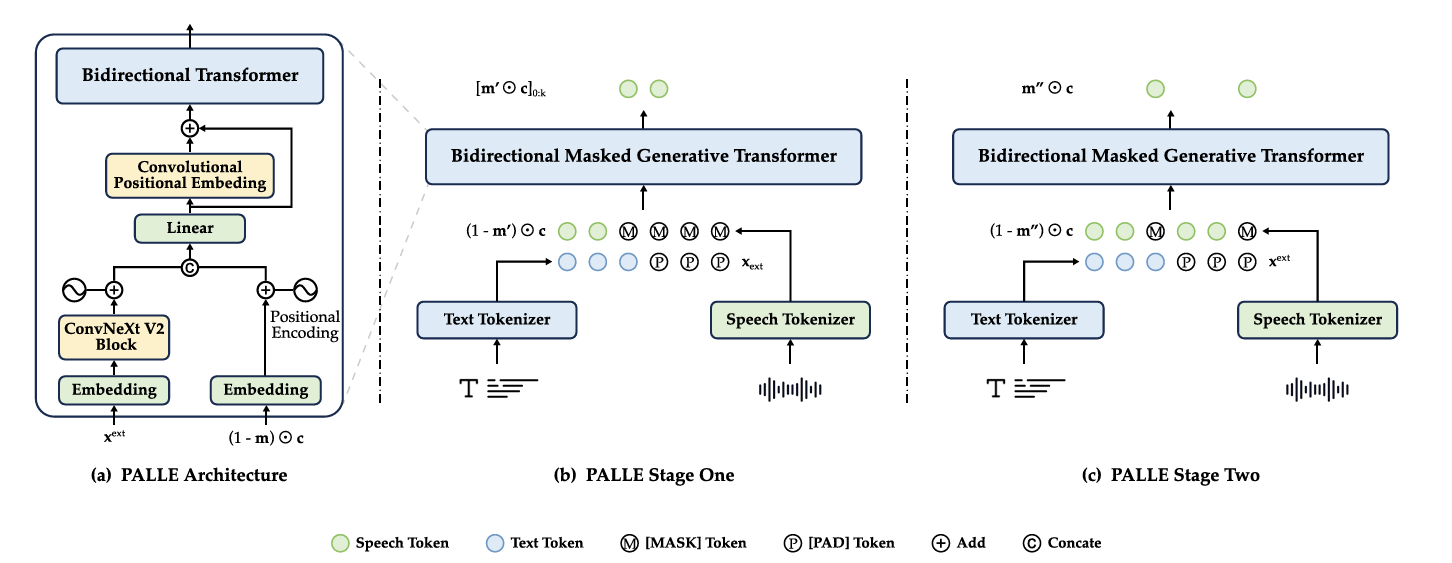 - Stage 1과 마찬가지로 $\mathbf{x}$는 speech token sequence $\mathbf{c}$의 length에 match 하기 위해 filler token $\text{[PAD]}$로 padding 됨