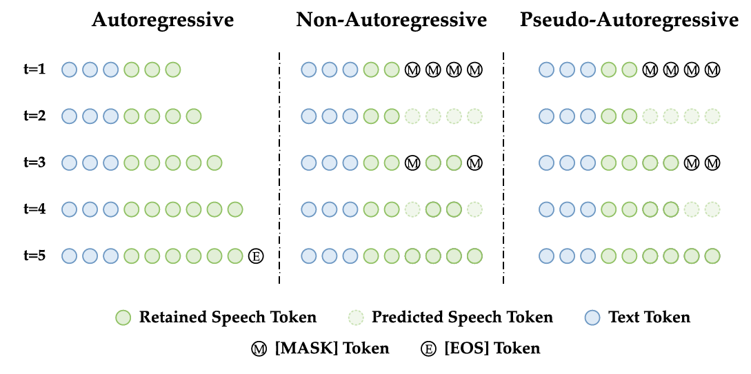 - Binary mask $\mathbf{m}_{(t)}$는 (Eq. 4), extended speech token sequence는 (Eq. 5)와 같이 iteratively update 됨: