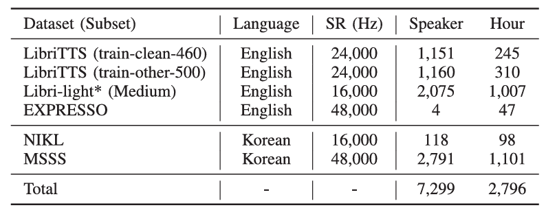 - Dataset : LibriTTS, Multi-Speaker Speech Synthesis (MSSS), EXPRESSO, NIKL