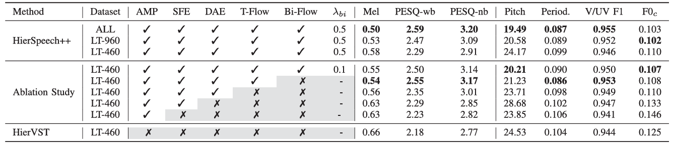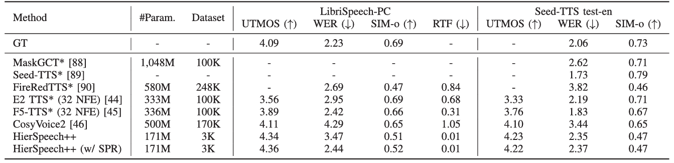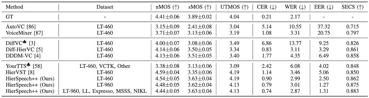 - Zero-Shot TTS에서도 HierSpeech++가 가장 뛰어남