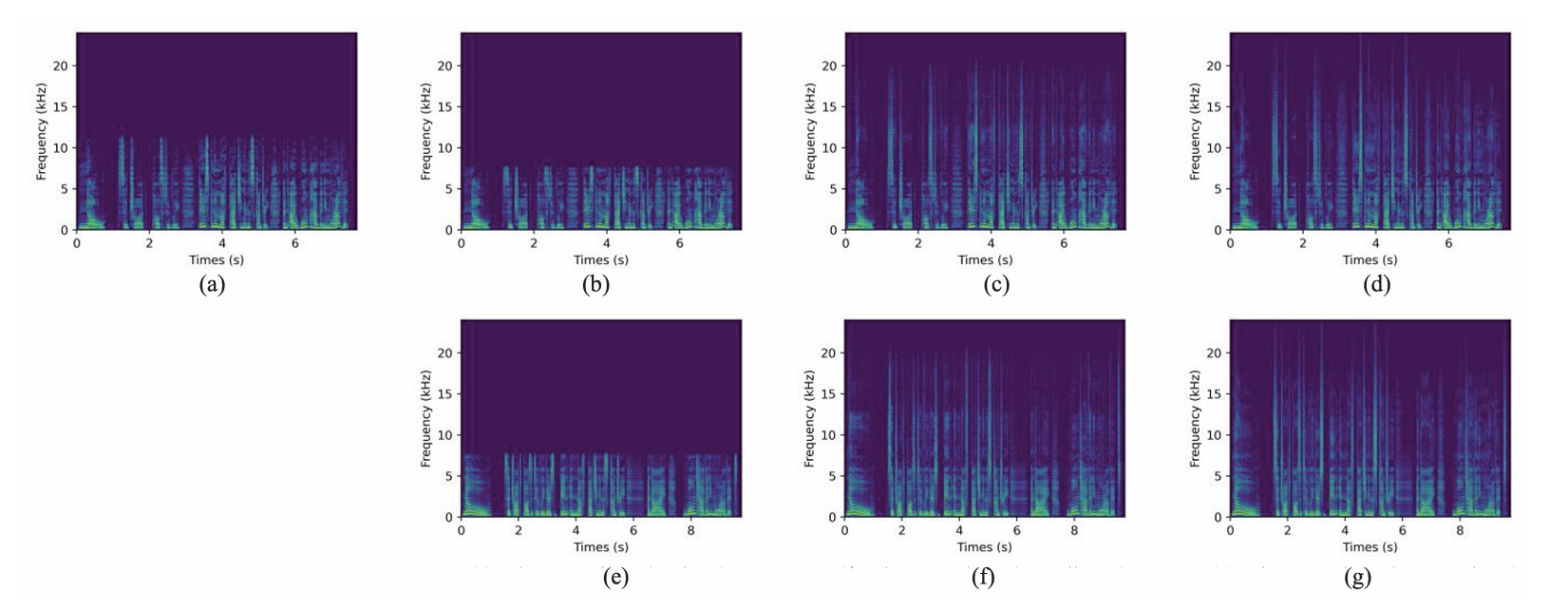 - (a) 24kHz GT, (b) 16kHz GT, (c) AudioSR, (d) SpeechSR, (e) 16kHz HierSpeech++, (f) AudioSR+HierSpeech++, (g) SpeechSR+HierSpeech++