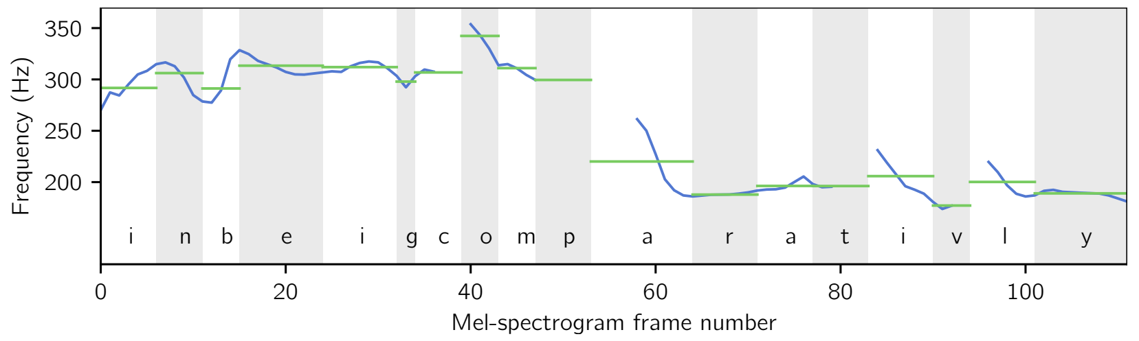 - 모든 input symbol에 대해 추정된 fundemental frequency (Pitch contour)를 conditioning
