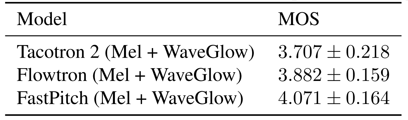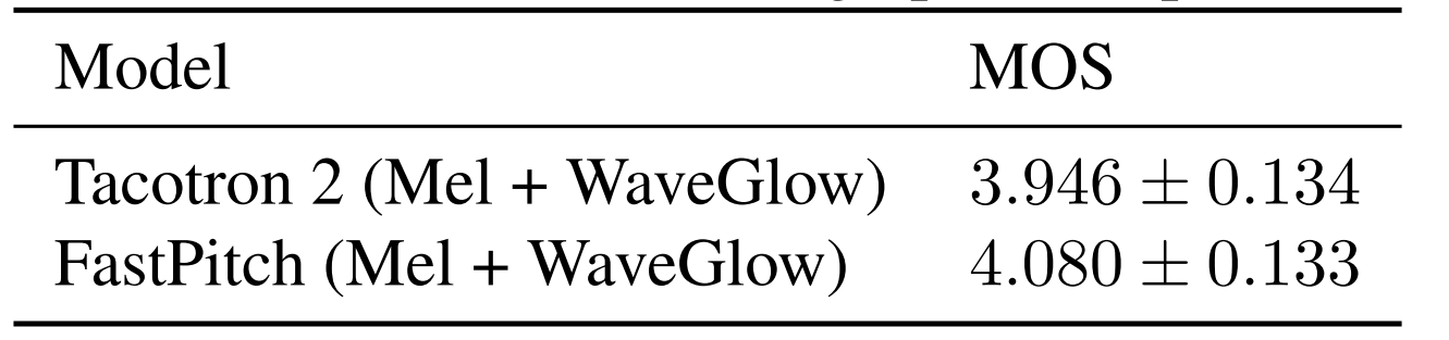 - MOS 측면에서 Tacotron2와 비교하면, FastPitch가 더 높은 품질의 음성을 합성할 수 있음