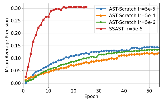 - Learning curve 측면에서도 SSAST는 더 빠르게 수렴함