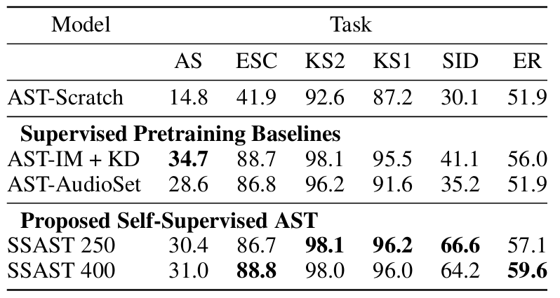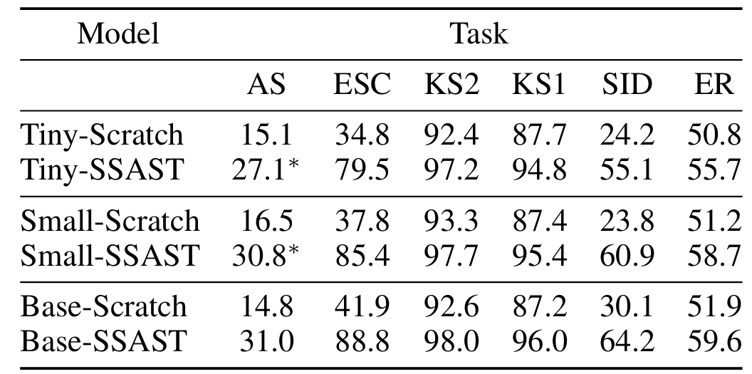 - 각 downstream task에 대해 SSAST는 최고의 성능을 보임