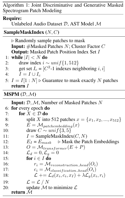 - 먼저 아래 [Algorithm 1]을 따라 각 input spectrogram $X$는 512 patch $x$로 split 되고 해당하는 patch embedding $E$로 convert 됨