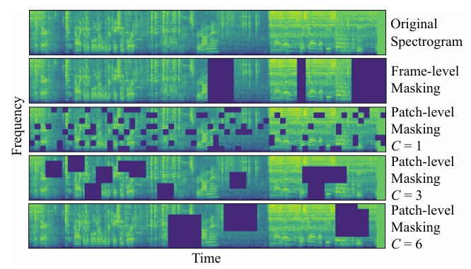 - 이를 통해 model은 pre-training 시 entire time frame이 아닌 spectrogram patch를 mask 하게 되므로 data의 temporal, frequency structure를 학습할 수 있음 - 추가적으로 논문은 아래 그림과 같이 masked patch cluster를 control 하기 위해 cluster factor $C$를 도입함