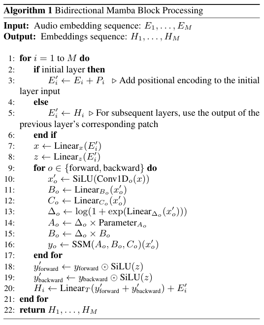 - Mamba encoder는 combined embedding $E_{i}+P_{i}$를 처리하여 forward/backward dependency를 capture 함 - $M$을 input sequence의 patch 수, $z$를 SSM block의 forward/backward output을 modulate 하는 intermediate representation이라고 했을 때, bidirectional modeling은 [Algorithm 1]과 같이 정의됨