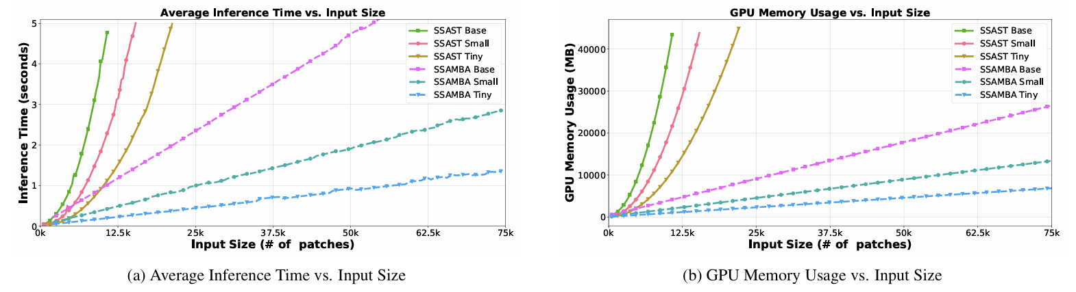 - SSAMBA는 SSAST와 비교하여 $92.7\%$ 더 빠른 추론 속도와 $95.4\%$의 memory efficiency를 가짐
