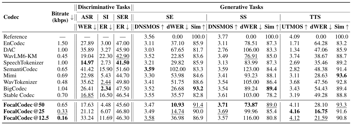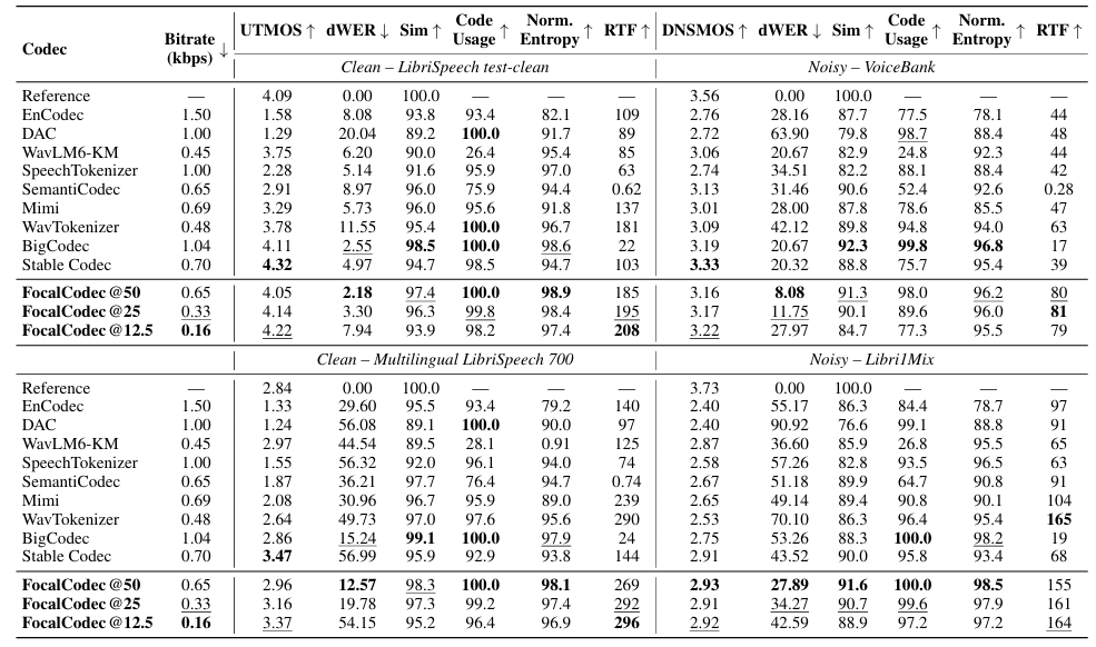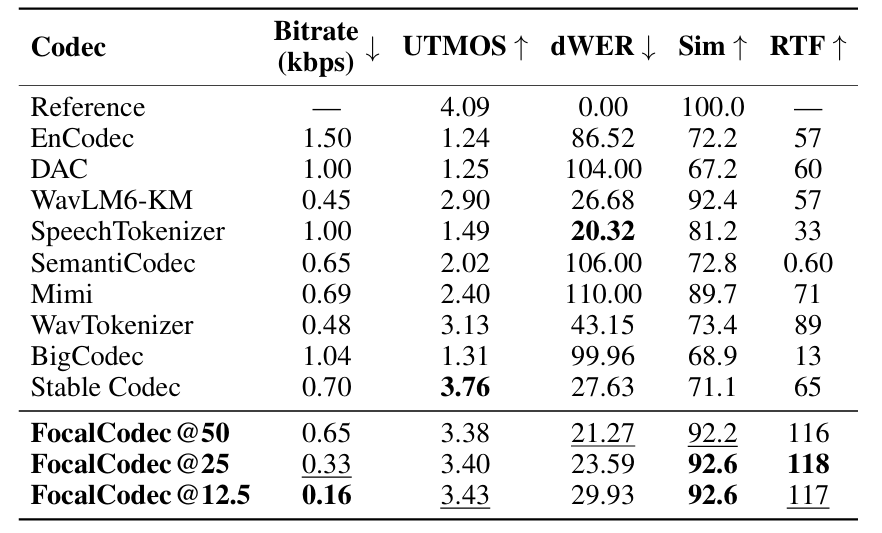 - Comparisons : EnCodec, DAC, WavTokenizer, SpeechTokenizer, WavLM, SemantiCodec, Mimi, StableCodec, BigCodec