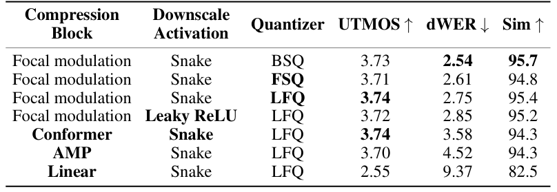 - Focal modulation을 기반으로 single binary codebook space로 speech를 compress