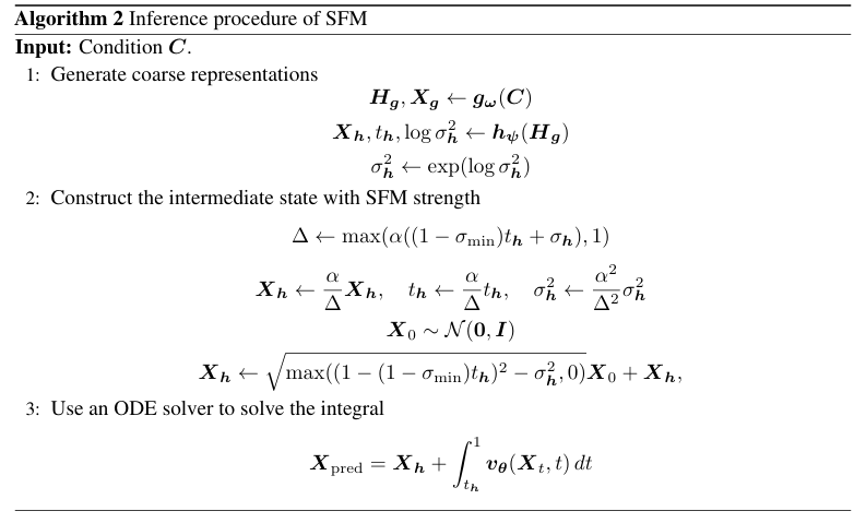 - 이를 해결하기 위해 논문은 SFM strength $\alpha\geq 1$을 도입하여 $\hat{t}_{h}$를 scale up 하고 $\hat{\mathbf{X}}_{h}$로부터의 stronger guidance를 보장함: