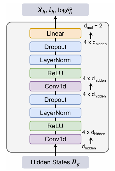 - Learnable parameter $\psi$를 가지는 lightweight SFM head $h_{\psi}$는 $g_{\omega}$의 final hidden state $\hat{\mathbf{H}}_{g}$를 input으로 하여 scaled mel-spectrogram $\hat{\mathbf{X}}_{h}$를 output 함