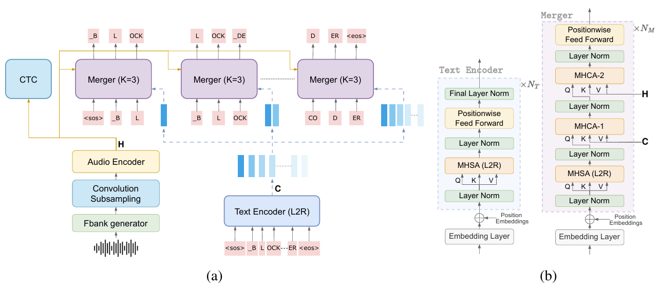 - Audio encoder로부터 audio context $\mathbf{H}$와 text encoder의 text-only context $\mathbf{C}$가 주어지면, Merger는 두 modality의 context를 jointly attend 하여 $K$ token block을 autoregressively generate 함