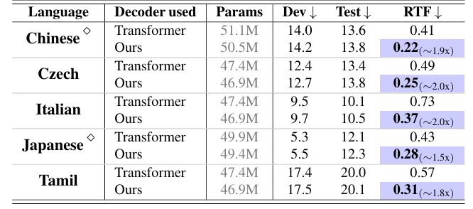 - 결과적으로 cross-attention-free text encoder와 lightweight merger 간의 responsibility division을 통해 BlockDecoder는 기존 decoder 보다 더 빠르고 정확하게 동작할 수 있음