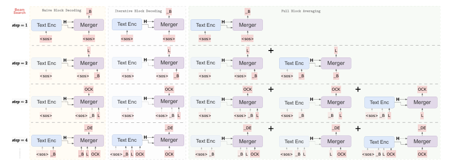 - $\mathbf{C}'=\text{TextEncoder}(\{y_{0},y_{1},...,y_{j-K}\})$ - 이는 score를 생성할 때 항상 block 내의 last position을 활용하고, text encoder와 merger를 각 decoding step 마다 forward 해야 하므로 sub-optimal 함