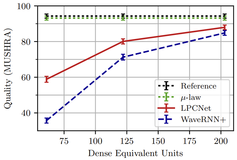 - LPCNet의 품질이 동일한 복잡도에 대해 WaveRNN의 성능을 크게 앞지름