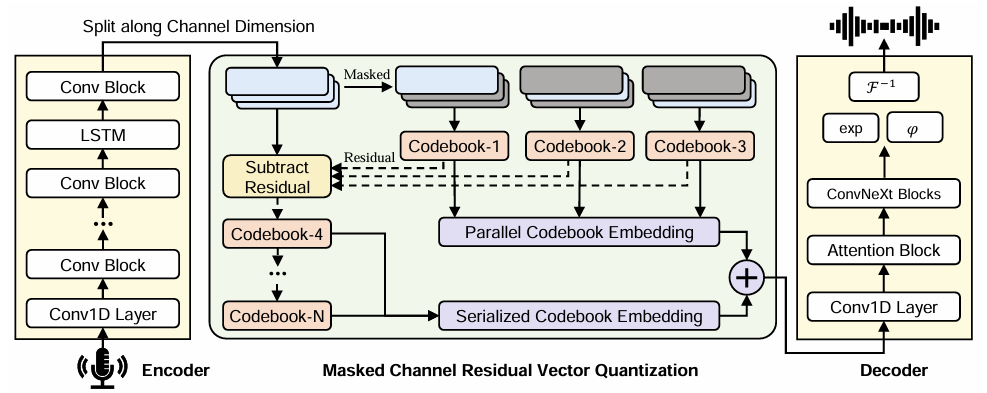 - Masked Channel Residual Vector Quantization (MCRVQ) module은 initial codebook channel의 informational content를 minimize 하면서 constrained channel에서 compensate 되는 information을 augment 하는 것을 목표로 함