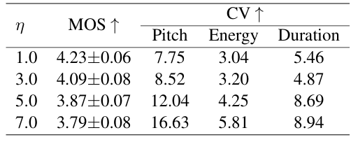 - $\eta$ : explicit prosodic feature의 diversity, quality를 balancing 하는 guidance intensity