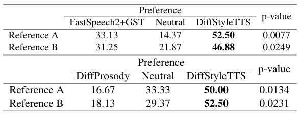 - Prosodic transfer 측면에서도 DiffStyleTTS가 가장 선호됨
