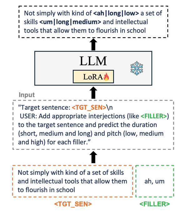- Input text를 기반으로 natural filler를 insert 하기 위해 LLM-based filler prediction module을 도입함