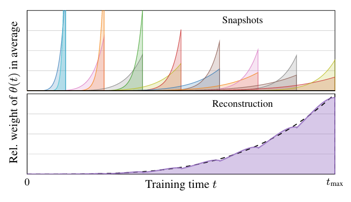 - 해당 averaged parameter vector는 training 시 save 되는 snapshot에 periodically store 됨 - Training 이후 EMA profile에 해당하는 approximate $\hat{\theta}$를 reconstruct 하기 위해: