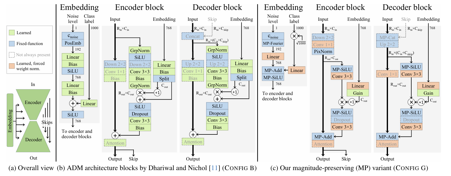- $t$ : current training iteration, $\alpha_{ref}, t_{ref}$ : hyperparameter - 결과적으로 $\texttt{Config E}$는 training 시 weight, activation magnitude를 successfully preserve 하여 FID를 $3.75$에서 $3.02$로 개선함