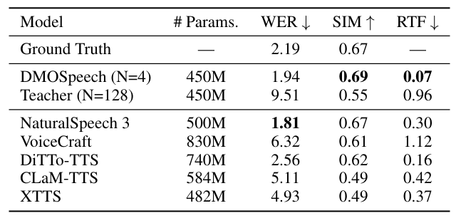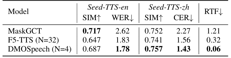 - RTF 측면에서도 DMOSpeech가 가장 빠름