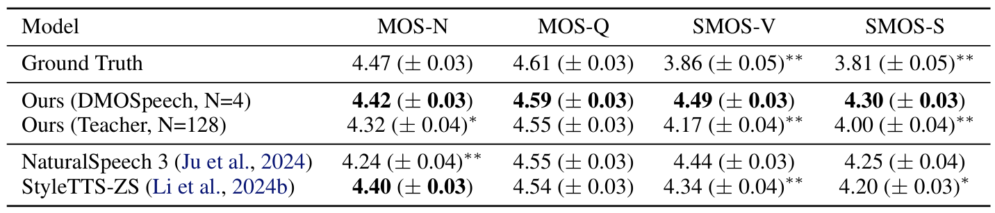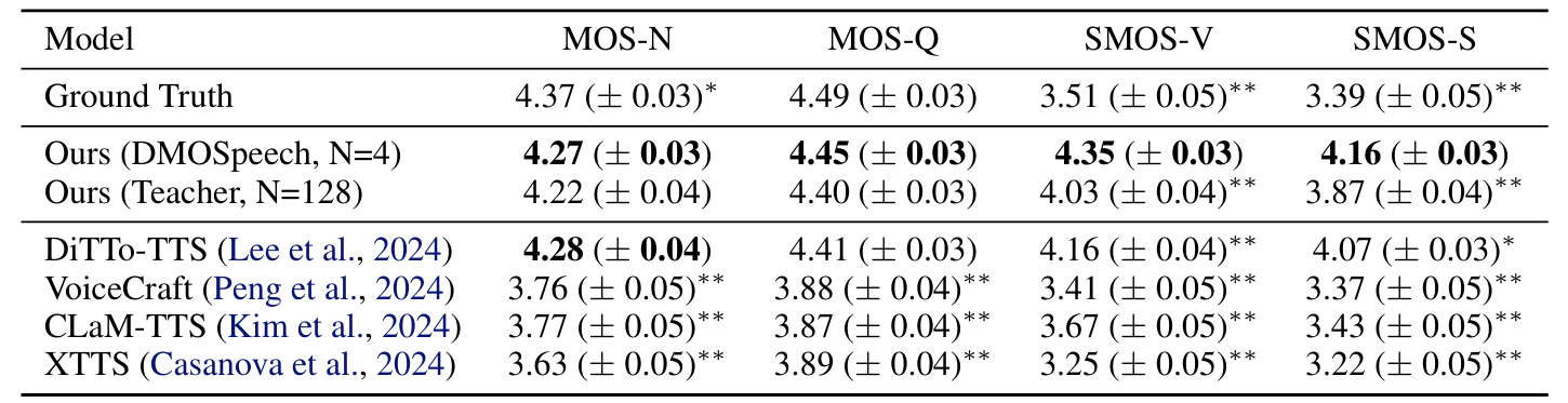 - 전체적으로 DMOSpeech의 성능이 가장 우수함