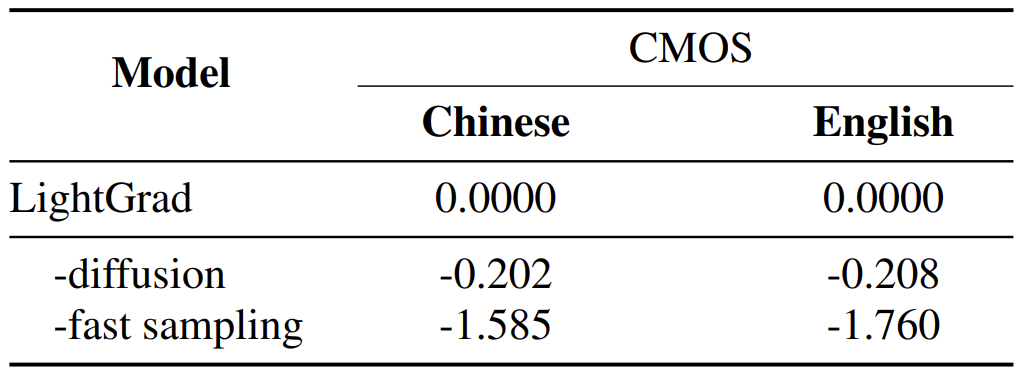 - Chinese dataset의 경우 LightGrad가 Grad-TTS 보다 더 우수한 합성 품질을 보임