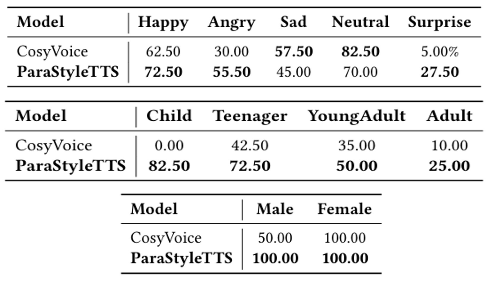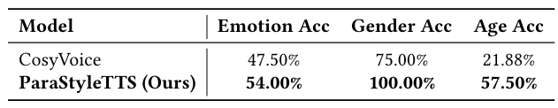 - Style accuracy, robustness 측면에서 ParaStyleTTS는 기존보다 뛰어난 성능을 보임
