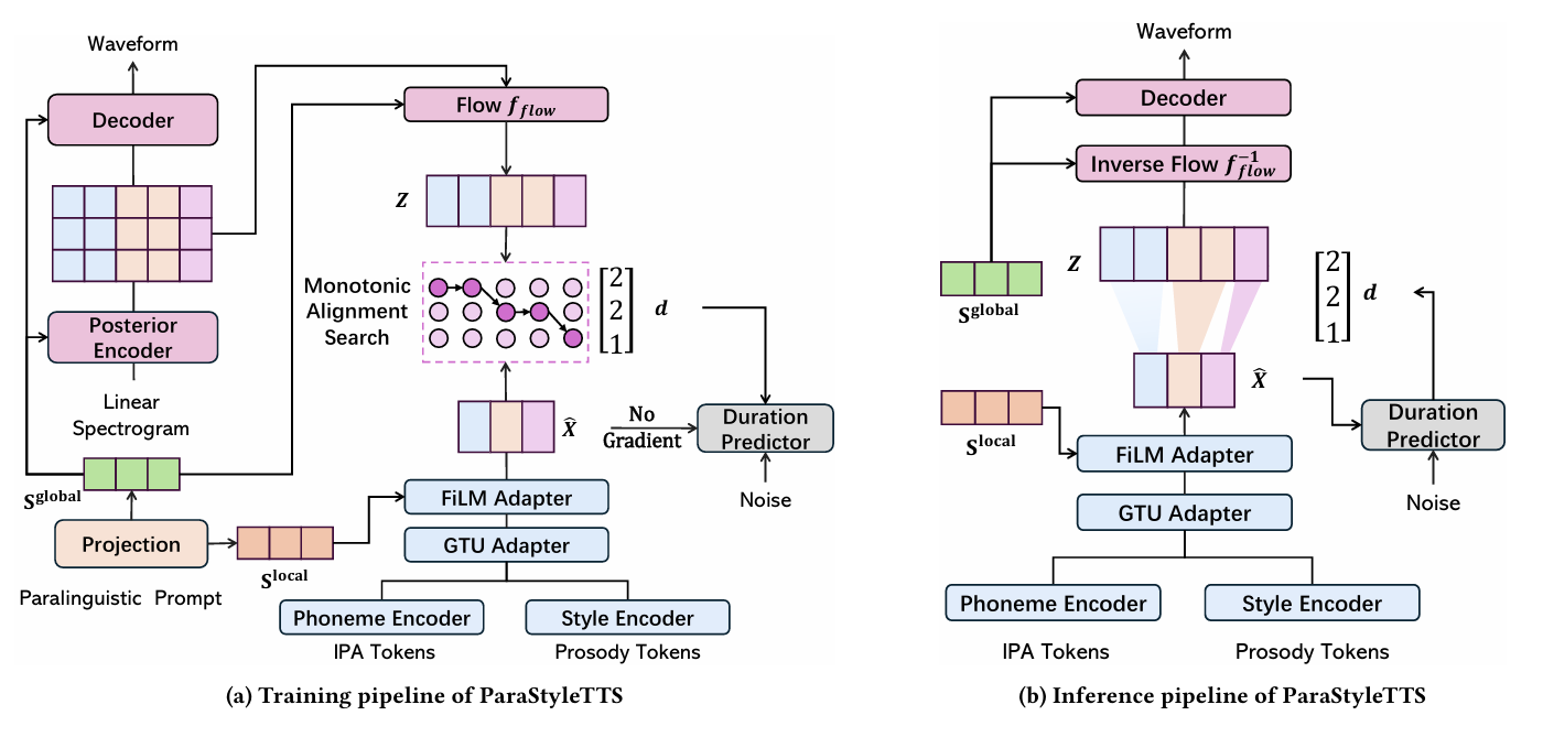 - 한편으로 sentence-level paralinguistic style embedding $\mathbf{s}^{global}$은 waveform decoder 내에서 sentence-level style adaptation을 guide 하기 위해 training/inference 모두에서 사용됨