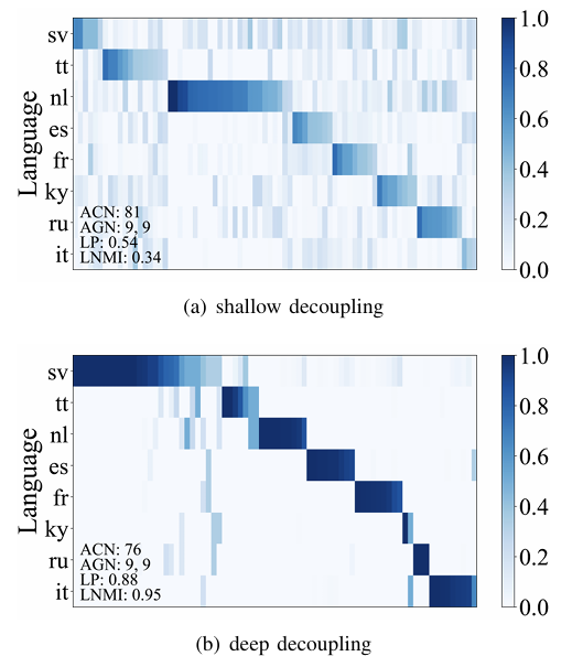 - Conditional probability $P(lang|code)$의 learned codebook을 확인해 보면, shallow decoupling scenario에서 language quantizer는 distinct alignment path를 capture 함