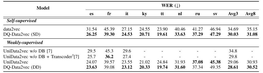 - 전체적으로 DQ-Data2Vec의 성능이 가장 뛰어남