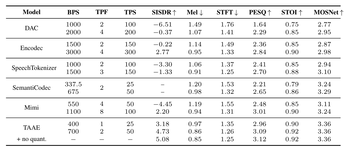 - Comparisons : DAC, EnCodec, SpeechTokenizer, SemantiCodec, Mimi