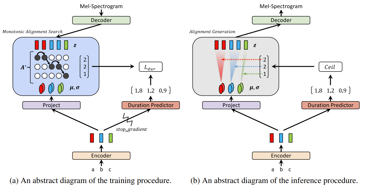 - Stop gradient operator는 backward pass에서 input의 gradient를 제거하는 역할 - 추론 과정에서 prior 분포와 alignment의 statistic은 text encoder와 duration predictor에 의해 예측됨