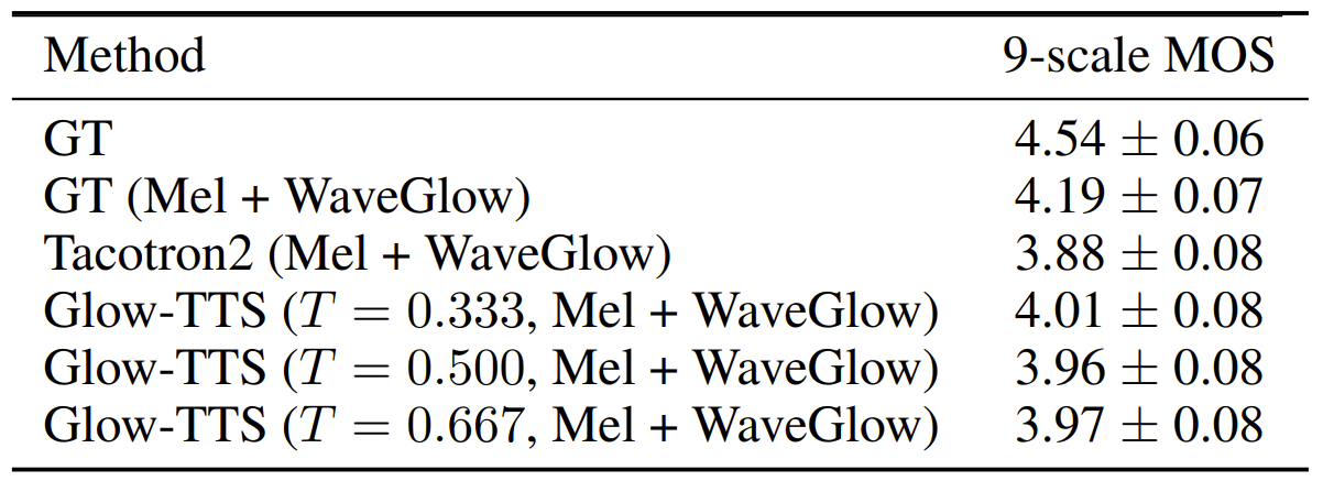 - Temperature가 0.333일 때, Glow-TTS가 가장 좋은 합성 품질을 보임