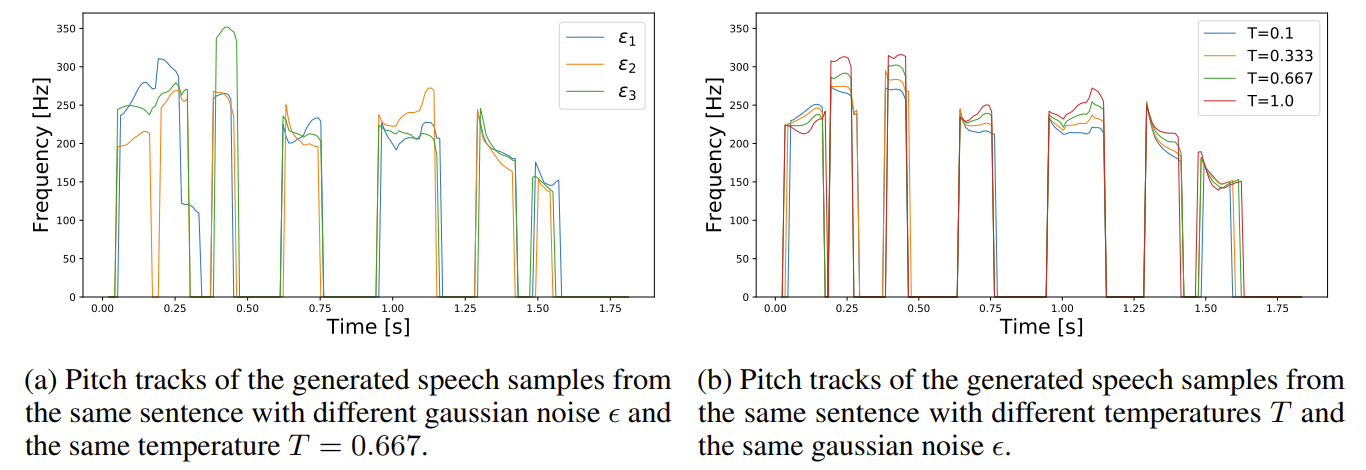 - Temperature를 변경하면 유사한 intonation을 유지하면서 pitch를 조절할 수 있음 - Positive scalar를 곱하면 speaking rate를 조절할 수 있음