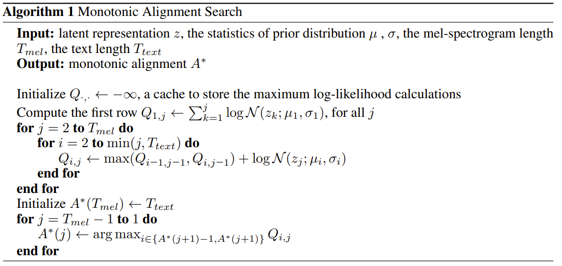 - MAS는 input speech와 text에서 가져온 latent variable과 prior 분포 간의 가장 가능성 높은 monotonic alignment를 탐색함