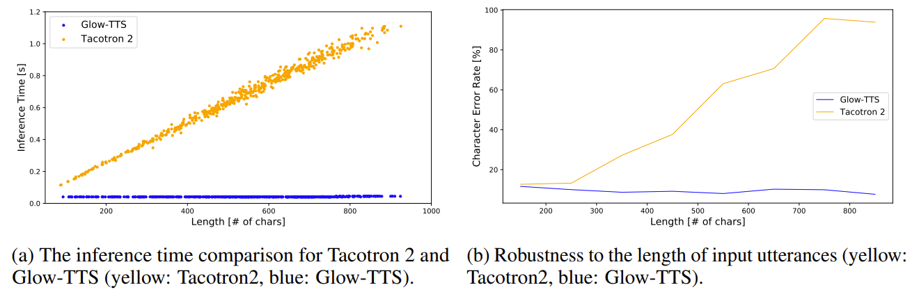 - Glow-TTS의 추론 시간은 length에 관계없이 40ms로 일정하게 나타나지만 Tacotron2의 경우 sequential sampling으로 인해 length에 따라 선형적으로 증가함