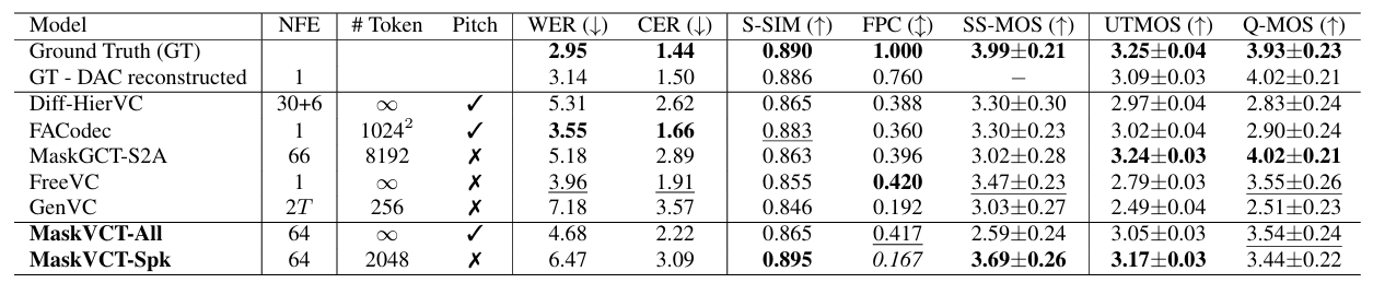 - 전체적으로 MaskVCT의 성능이 가장 우수함
