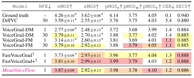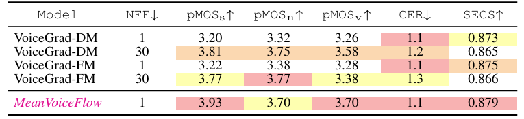 - 전체적으로 MeanVoiceFlow의 성능이 가장 우수함
