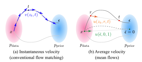 - 이때 average velocity는 $u(z_{t},r,t)=\frac{1}{t-r}\int_{r}^{t}v(z_{\tau},\tau)d\tau$와 같이 정의되어 두 time step $r,t$ 간의 displacement를 나타냄